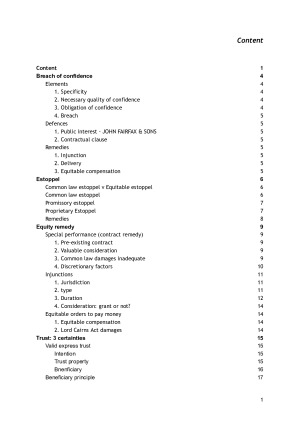 Introduction: This study notes distil essential topics and case summaries crucial for a comprehensive grasp of the subject matter. Focused on Breach of Confidence, Estoppel, Equity Remedy, Trust (3 Certainties, Obligations and Rights), Fiduciary Obligation, Resulting Trust, Constructive Trust, and Tracing, they provide a succinct overview of core principles and case analyses, aiding efficient learning and review. Main Content Summary: 1. Breach of Confidence: Case facts and legal principles summarized. 2. Estoppel: Doctrine explained with key case summaries. 3. Equity Remedy: Overview of equitable remedies and relevant cases. 4. Trust (3 Certainties): Elements and case examples of trust creation. 5. Obligations and Rights of Trust: Summary of trust duties and rights. 6. Fiduciary Obligation: Duties outlined with relevant cases. 7. Resulting Trust: Understanding through case precedents. 8. Constructive Trust: Principles and case summaries. 9. Tracing: Explanation and significant case applications. These concise study notes provide a streamlined overview of core concepts and case law. They facilitate efficient study and comprehension, serving as an indispensable resource for students and practitioners