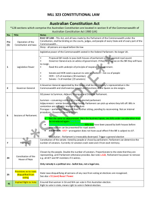 📗HD CONSTITUTIONAL LAW EXAM NOTES 📗 * T3 2023* Includes a section outlining all the relevant provisions and legislation while linking to core legal principles and key cases associated with each. Giving you a comprehensive snapshot for quick recall and fuss free referencing during exams. Provides ~ clear explanations of complex legal principles, a full breakdown of landmark cases and detailed understanding and application of legislation ~ to help you ACE the exam with ease! Topics covered: 1. Introduction to Australian Constitutionalism 2. Characterisation 3. Commonwealth Legislative Powers 4. The Executive 5. Inconsistency and Intergovernmental Immunities 6. Constitutional Rights and Freedoms 7. Separation of Powers All the best for your studies!