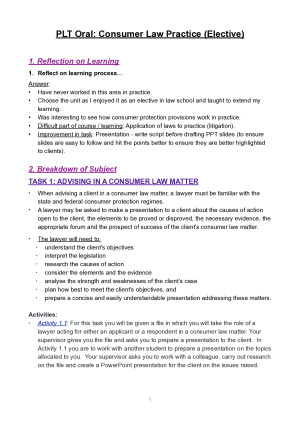 ADVANTAGES OF NOTES - Notes cover every examinable topic for the College of Law Practical Legal Training Consumer Law oral assessment (including the tasks that are required to be submitted prior to the oral). - Notes are broken down by task (to follow the style and order of questioning in oral assessment). - You can simply just read from these notes when responding to questions asked by assessor. - Notes include comments based on feedback from lecturers on activity submissions and the practice papers supplied by the College of Law. TOPICS COVERED IN NOTES - Reflection on learning - Task 1: Advising in consumer law matters - Consumer Law Practice - Unfair contract terms - Consumer guarantees - Product safety - Consumer protection and fair trading - Jurisdiction - Practice and procedure - Commencing proceedings - Minutes of orders - Taking instructions and advising - Alternatives to litigation - Case preparation - Task 2: Drafting consent orders and covering advice - Legal writing and drafting - Enforcement of judgments - Sample Questions (contained with each topic)