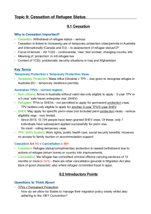 - These notes cover every examinable topic for the subject ‘International Refugee Law and Practice’ and will assist you with both the research assignment and final take home exam. - Notes are extremely comprehensive and are broken up into two sets of notes. The first set are ‘general class notes’ and the second set are specific to the take home exam and its problem questions and policy questions. - Notes include key areas of the subject such as: international protection regimes for refugees under international refugee law, human rights laws, and the law of the sea. - Content of ‘general class notes’ will also assist you in generating real-time responses to class discussions. - All relevant cases, international conventions, legislations etc are throughly discussed in notes. TOPICS COVERED - Topic 1: International Law and the Refugee Convention - Topic 2: The Australian Refugee Law System - Topic 3: Access to Asylum & The Principle of Non-Refoulement under International Law (Art 33 Refugee Convention) - Topic 4: Non-Refoulement in Australia - Topic 5&6: The Definition of a ‘Refugee’ - Article 1A(2) - Topic 7: Complementary Protection - Topic 8: Limitations on Protection - Relocation & Exclusion - Topic 9: Cessation of Refugee Status - Topic 10: Refugee Status Decision Making