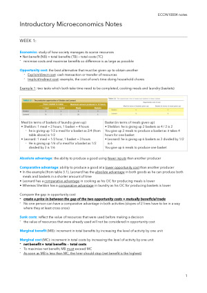 Summary (includes examples): Week 1: Introduction Week 2: Supply and demand, market equilibrium Week 3: Elasticities, welfare in PCM Week 4: Government intervention, international trade Week 5: Market failures Week 6: Key decisions and concepts, cost, technology and scale Week 7: Entry and exit decisions, short and long run supply Week 8: Market power and monopolies Week 9: Price discrimination Week 10: Introduction to game theory Week 11: Oligopoly, game theory applications Week 12: Review
