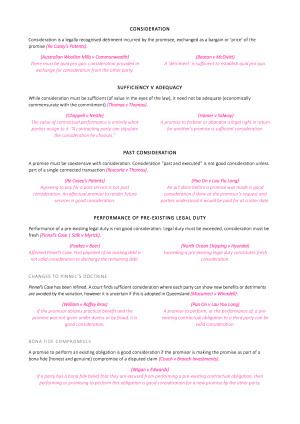 Concise but detailed notes for Law of Contracts II containing all weeks of content. This condensed and clear format is perfect to take into the final exam. Ratios of each case are extrapolated and cited for almost all information given so that all responses will be backed by evidence, boosting your marks. Full case summaries are available separately or to be bundled for a discount. Search "LAWS1701 Law of Contracts II Exam Notes and Case Summaries". Topics include: - Consideration - Formalities - Part Performance - Equitable Estoppel - Remedy for Estoppel - Express Terms - Incorporating Terms - Implied Terms - Sale of Goods Act - Australian Consumer Law - Exception Clauses - Unfair Contract Terms