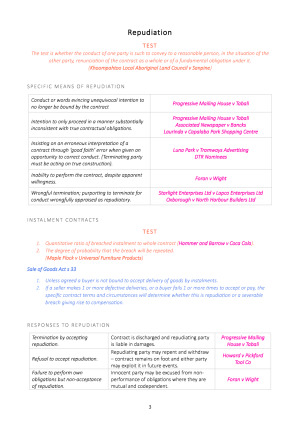 Concise but detailed notes for Law of Contracts II containing all weeks of content. This condensed and clear format is perfect to take into the final exam. Ratios of each case are extrapolated and cited for almost all information given so that all responses will be backed by evidence, boosting your marks. Full case summaries are available separately or to be bundled for a discount. Search "LAWS1702 Law of Contracts II Exam Notes and Case Summaries". Topics include: - Discharge by performance - Repudiation - Breach - Express or implied essentiality - Election - Termination - Specific performance - Injunctions - Equitable Damages - Theory of Damages - Assessment of Damages - Limits on Damages - Complications in Assessment - Penalties - Recission - Vitiating Factors - Misrepresentation - Misleading or Deceptive Conduct - Duress - Undue Imfluence - Unconscionable Dealing - Statutory Unconscionability - Third Party Impropriety