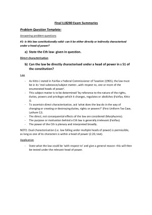 These LLB2280 notes helped me to achieve an incredible result of 95 in the Constitutional Law final exam. The notes include detailed problem question templates on all relevant constitutional heads of power, while supplementing this with potential essay/short answer-related notes (for constitutional law issues) which cover every single case succinctly and in the appropriate level of depth. Topics included: 1. Introduction to Constitutional Law 2. Direct and Incidental Characterisation 3. Corporations Power (s 51(xx)) 4. External Affairs (s 51(xxix)) 5. Defence Power (s 51(vi)) 6. Nationhood Power (s 61 and s 51(xxxix) 7. Laws with respect to territories (s 122) 8. Acquisition of property on just terms, freedom of religion, interstate residence discrimination, right to trial by jury, implied freedom of political communication 9. Separation of Powers 10. s 96 grants 11. Constitutional validity of state laws 12. General notes on fundamental freedoms etc.