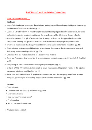 Notes on- *Criminalisation *Justifications for criminal and morality *Colonialism and Indigenous Peoples *The Criminal Process (1) & (2) *Miscarriages of justice *Social control, regulation, arrests and reasonable force *Stop and search without a warrant *STMPs and Bail *Components of criminal offences (1) & (2) *Interpreting statutory offences: He Kaw The, strict liability *NSW DRUG OFFENCES *Public Order: Racial vilification; move-on powers; crowd control and protest *Normative theories and consorting **Very long document with key points from lectures, tutorials and textbook readings :)