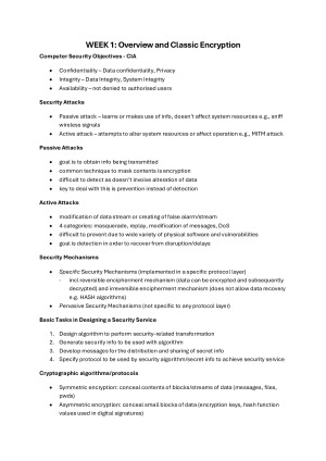 Detailed content notes for Week 1 -7 that helped me get a HD. Topic List: - Overview and Classic Encryption - Block Ciphers and Data Encryption Standard - Number Theory Infinite Fields - Advanced Encryption Standard (AES) - Block Cipher Operation - Pseudorandom Number Generation and Stream Cipher - Public Key Cryptography and RSA