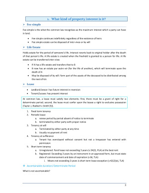 High quality H1 in Property Notes. The structure of the notes is not based on how it was taught in the course, but based on how a hypothetical should be answered. **Please note that these are in no way a substitute of the actual prescribed readings and cases** Table of Contents: 1. What kind of property interest is it? Fee simple Life Estate Lease If it is not a lease, is it a license? Security Interests Liens and Charges Mortgages Options Easements Profit a prendre Special cases: property Spectacle 2. How did the property interest arise? Legal Formalities: Sale of an interest Formalities: Transfer of legal title Exception to formalities: Adverse Possession Priority dispute Equitable Preliminary matters: rules for existence of equitable interests Remedy: specific performance Remedy: Estoppel Part Performance v Estoppel (Pipikos) 3. Whose interest has priority? When there is one registered interest (Torrens): indefeasible When there are two registered interests (Torrens) When there are two unregistered interests (General Law) When there is a mere equity and an unregistered interest 4. Native Title How is native title extinguished? Fee Simple Pastoral Lease Mineral Lease Mining Lease Statute/Legislation Compensation for Native Title Two components of compensation