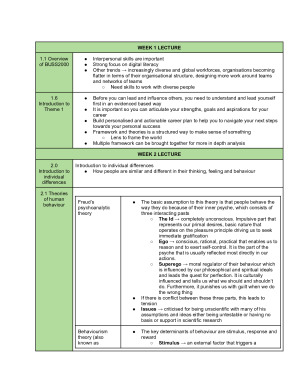 High quality notes ! Struggling to keep up with the workload in BUSS2000? Looking for a way to make studying more efficient and less overwhelming? These notes are exactly what you need! I've meticulously compiled all the essential information from readings, lectures, and tutorials into one easy-to-read document. These notes are designed to simplify complex concepts and save you hours of study time. ✓ Concise and to the point ✓ Systematically organized ✓ Comprehensive coverage of all course materials TOPICS COVERED - Week 2: Individual differences - Week 3: Motivation and goal-setting - Week 4: Career goals, values & ethics - Week 5: Theme 1 in practice - Week 6: Diversity and culture - Week 7: Team and group processes - Week 8: Managing perceptions and conflict - Week 9: Theme 2 in practice - Week 10: Leadership, power and influence - Week 11: Communication and feedback - Week 12: Career sustainability: Managing relationships and stress
