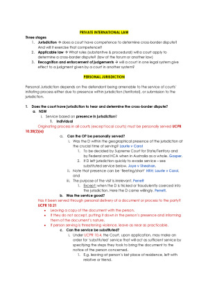 These private international law notes have been designed for sitting an in-person exam with easy to follow scaffolds for the mid-semester and final exam. The notes include step-by-step guides for answering a problem question and short one-sentence summaries of case facts. I used these notes in the exam and obtained a HD (85). They cover the following topics: 1. Does the court have jurisdiction? 2. Will the court exercise its jurisdiction? 3. Anti-suit injunctions 4. Choice of law - methodology 5. Choice of law - contracts and equity 6. Choice of law - torts 7. Mandatory law 8. Substance vs. procedure 9. Pleading foreign law 10. Exclusionary doctrines 11. Recognition and enforcement of judgment