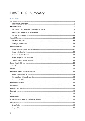 These notes provide a clear breakdown of all Criminal Law principles, outlining the elements of each offence and all statutory provisions and cases. They also include scaffolds which are easy to follow in the exam. List of topics: - The Elements of Criminal Offences I - The Elements of Criminal Offences II - Homicide I: Murder - Homicide II: Unlawful and Dangerous Act Manslaughter; Gross Negligence Manslaughter - Assault, wounding and GBH offences - Assault, wounding and GBH offences/ Sexual offences - Sexual Offences - Larceny - Complicity - Extreme Provocation - Self-defence and Excessive self-defence - Duress and Necessity - Mental Health Impairment or Cognitive Impairment and Substantial Impairment by Mental Health Impairment or Cognitive Impairment - Automatism (involuntariness) - The use of evidence of (i) mental illness or (ii) self-induced intoxication to negate intent