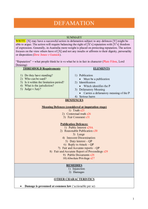 My notes are centred around answering the defamation hypothetical on the exam with some additional information and brainstorming idea for the essay. Jason Bosland was my prof when I took media. See preview for table of contents of all topics covered. There is: - a table of contents - approaches and overviews for how to tackle the exam - covers the new s29A defence and a bit on the new Russel case - has a section on some essay advice and questions to get you postulating on some essay topics - relevant case facts and outcomes are put in the section where it is relevant to the section and also larger case summaries at the end - cases and statutory sections are cited throughout and I always try to put them in red so its easy to find when on an exam to cite sources properly. - things are generally colour coded and there are tables as well to help with digestion of information - includes notes on how to draft your imputations, although to be honest once you're in the exam you don't really have time to read through these kinds of things. You either know how to draft them at that point or you don't.