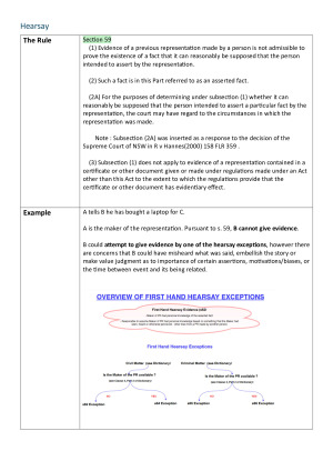 Complete coverage of entire course! Succinct and easy to comprehend notes that are a must have for the final take home exam! Notes are in a table structure, making it easy to comprehend and keep track of course content. All relevant sections of the Act are integrated within the notes so that you don't have to switch tabs to the Act itself! Cases are summarised, with main points highlighted, making it easier to remember key points and apply to problem scenarios in the final take home exam! Contents of the Notes: Evidence Act Provisions Admissibility Flow Chart Basic Principles of Evidence Law Documents + Real Evidence Witnesses Calling Witnesses, Competence, Compellability The Examination of Witnesses The Right to Silence Relevance Hearsay Exception- First Hand Hearsay Other Exceptions Credibility Evidence Hearsay Evidence for a Non-Hearsay Purpose – Exception to Hearsay Admissions – Exception to Hearsay Character Opinion Evidence Tendency and Coincidence Privilege Exclusions and Judicial Warnings