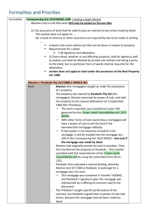 These notes are a complete coverage for the high fail rate subject, Real Property! They were the reason I got a HD for the subject. These notes include all relevant cases, documented in a summary manner to make it easier to comprehend and apply to the relevant factual scenario. They are also helpful to refer to when applying to the weekly tutorials. These notes also include detailed notes on the videos necessary to watch for the Part A Quiz, making them handy to refer back to during the quiz. All relevant sections of any legislation is included WITHIN the notes, so you don't have to worry about flicking between tabs! Especially during the take home exam where every minute counts :) The contents: Contents Introduction to Land and Fixtures; Tenure and Estates; Native Title Part A Quiz Notes Indefeasibility and Exceptions to Indefeasibility Assurance Fund, Caveats, Priority Notices Formalities and Priorities Co-Ownership Strata Leases Mortgages Easements Covenants