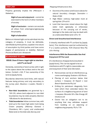 Scored 46/50 on exam. Topics Covered: Introduction to Land and Land Law; Native Title; Co-ownership; Introduction to the Torrens System and Dealings with Land; Exceptions in Indefeasibility; Priorities (Competing Equities) and Caveats; Nature and Creation of Leases; Covenants and Dealings with Leases; Termination of Leases; Easements; Mortgages; Subdivision and Community Title. Weeks Covered: 1-12 Perfect succinct notes to bring into in-person exam.