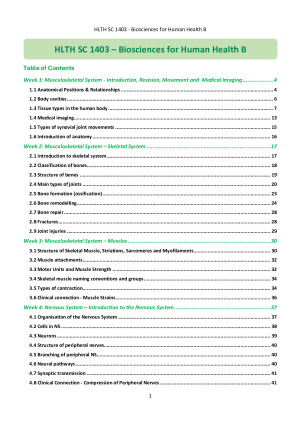 • High distinction (HD) - 90/100 achieved • Complete, concise, high yield notes • Assessments and exams-based • Lots of diagrams and images included to help with visualisation • Tricks to memorise and mnemonics included Contents • Week 1: Musculoskeletal System - Introduction, Revision, Movement and Medical Imaging • Week 2: Musculoskeletal System – Skeletal System • Week 3: Musculoskeletal System – Muscles • Week 4: Nervous System – Introduction to the Nervous System • Week 5: Nervous System – The Central Nervous System • Week 6: Nervous System – The Peripheral Nervous System • Week 7: Nervous System – The Autonomic Nervous System • Week 8: Regional Anatomy – Regional Anatomy of the Trunk • Week 9: Thoracic Cavity • Week 10: Abdominopelvic Cavity • Week 11: The Integumentary and Lymphatic Systems