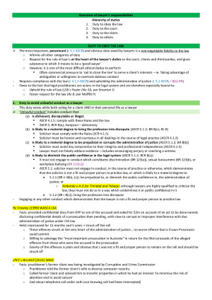 Highly comprehensive exam notes for Ethics (LAW4309) that enabled me to get HD (83) in the unit in Sem 1 2024! - Up to date and colour-coded, includes detailed tables and easy to follow flow-charts - All relevant case summaries and key rulings great for revision - A concise and detailed exam script to help structure your answers Topics 1. Duties to the law and duties to the court 2. Specific duties in civil and criminal matters 3. Confidentiality 4. Conflicts of interest 5. Costs and trust accounting 6. Admission to practice 7. Complaints 8. Types of misconduct