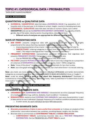 One of the things I have observed that other students often neglect is clearly defining terms and finding clear connections between them. This is the approach off of which these notes are based. The notes are detailed, as well as relevant and specific to the course. The understanding is clearly outlined as a result of questioning TAs and searching the Internet for concise explanations so that you won't need to do the searching yourself. The wording aligns with what the unit has taught is correct exam practice. ETC1000 covers 8 topics: 1. Categorical data & probability (eg independence) 2. Numerical data (eg histograms, normal distributions) 3. Patterns in data (eg correlation, covariance) 4. Uncertainty (eg confidence intervals, z-values) 5. Hypothesis testing (eg hypotheses, significance level) 6. Multiple linear regression (eg the multiple linear regression model) 7. Prediction (eg time-series graphs, modelling) 8. Business modelling (eg optimisation)