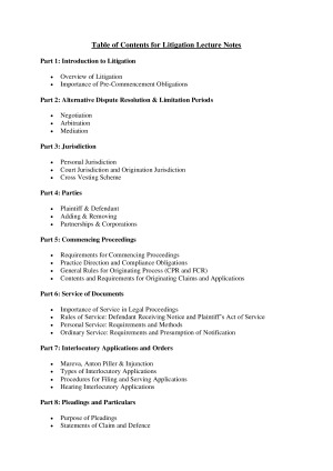 Part 1: Introduction to Litigation • Overview of Litigation • Importance of Pre-Commencement Obligations Part 2: Alternative Dispute Resolution & Limitation Periods • Negotiation • Arbitration • Mediation Part 3: Jurisdiction • Personal Jurisdiction • Court Jurisdiction and Origination Jurisdiction • Cross Vesting Scheme Part 4: Parties • Plaintiff & Defendant • Adding & Removing • Partnerships & Corporations Part 5: Commencing Proceedings • Requirements for Commencing Proceedings • Practice Direction and Compliance Obligations • General Rules for Originating Process (CPR and FCR) • Contents and Requirements for Originating Claims and Applications Part 6: Service of Documents • Importance of Service in Legal Proceedings • Rules of Service: Defendant Receiving Notice and Plaintiff’s Act of Service • Personal Service: Requirements and Methods • Ordinary Service: Requirements and Presumption of Notification Part 7: Interlocutory Applications and Orders • Mareva, Anton Piller & Injunction • Types of Interlocutory Applications • Procedures for Filing and Serving Applications • Hearing Interlocutory Applications Part 8: Pleadings and Particulars • Purpose of Pleadings • Statements of Claim and Defence • Amending Pleadings – Mistake • Providing Further and Better Particulars Part 11: Ending Proceeding’s Early • Discontinuance • Consent Judgement • Default Judgement • Summary Judgement Part 12: Settlement • Calderbank Offer • Offers of Compromise Part 13: Judgment and Orders • Delivering Judgments • Types of Orders: Final, Interlocutory, Consent • Procedures for Enforcing Orders • Costs and Interest on Judgments Part 14: Appeals • Grounds for Appeal • Procedures for Filing an Appeal • Preparing Appeal Documents • Hearing of Appeals Part 15: Additional Content and Exam Tips • Frameworks • General Answers