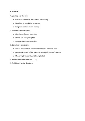 Summary Notes for MBB1 (2024 syllabus)!!! - Cover all topics, including Learning and Cognition, Sensation and Perception, Behavioral Neuroscience, and Research Methods!!!! - Easy to understand and memorize! (short & sweet) --> MOST IMPORTANT: modified after taking the final exams in 2024🤫 (so only useful content included!) - Multiple Self-Made Practice Questions (MCQ - simulate final exam questions) provided for you to test your understanding and strengthen your memory (with answers provided) --> also modified based on the final exams in 2024 taken🤭! I only reviewed this note and did the practice quiz that the school provided, and I got a high H1 (97%) for my final exam. This note included all the information to get a High H1 for MBB1!!!