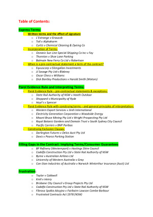 Full in-depth Contracts B Exam Notes. Content include extensive case summaries, problem question scaffolds and thorough case law beyond the course requirements to help get that HD in exams!!. Topics include: - Express terms - Pre-contractual statements - Construing terms - Implied terms - Frustration - Performance, Breach and Termination - Repudiation and the election - Statutory intervention: misleading and deceptive conduct - Remedies