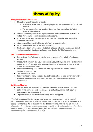 Dive deep into the intricate world of "Equity and Trusts" with our meticulously compiled course notes, tailored for law students seeking a thorough understanding of this complex legal area. These notes are your compass through the historical evolution of equity, the nuanced operation of trusts, and the critical analysis of key legal principles and cases that have shaped this field. Here's a snapshot of what's covered: - Historical Foundations of Equity: Explore the origins and development of equity, from its emergence as a response to the rigidity of common law to its evolution into a distinct body of principles aimed at achieving justice and fairness. - The Nature and Purpose of Trusts: Gain insights into the use and evolution of trusts, understanding how they've transformed from medieval arrangements into versatile tools for managing property and assets in commercial, family, and testamentary contexts. - Critical Legal Doctrines and Maxims: Master the core doctrines and maxims that underpin equitable judgments, providing a framework for interpreting and applying equitable principles to a variety of legal situations. - Equitable Remedies and Jurisdictions: Learn about the exclusive, concurrent, and auxiliary jurisdictions of equity, and how equitable remedies such as injunctions, specific performance, and rescission are employed to address legal wrongs. - Contemporary Issues and Challenges: Engage with modern debates and challenges within equity and trusts, including the impact of technological advancements and changes in societal norms on traditional equitable concepts and trust structures. - Case Law Analysis: Deepen your understanding through detailed analysis of landmark cases that illustrate the application of equitable principles and the functioning of trusts, enhancing your ability to critically evaluate and argue complex legal issues. - These notes not only serve as a comprehensive study aid but also equip you with the analytical skills necessary to navigate and contribute to the ongoing development of equity and trust law. Perfect for exam preparation, legal writing, or as a reference in practice, this resource is indispensable for anyone aiming to excel in the study or practice of law. Key Concepts: - History of Equity - Equitable Interests - Constructive Trusts - Assignments in Equity - Priorities - Fiduciary Duties and Confidentiality - Confidentiality - Trusts - Express Trusts - Conditional interests and the Rule against Perpetuities - Charitable Trusts - Powers and Duties of Trustees - Appointment and Removal of Trustees - Indemnity, Contribution and Directions - Variation and Termination of Trusts - Remedies to Breach of Trust - Tracing