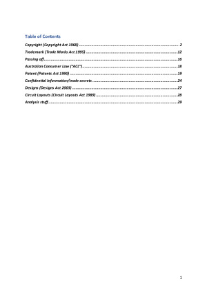 Table of Contents Copyright (Copyright Act 1968) ........................................................................................ 2 Trademark (Trade Marks Act 1995) .................................................................................12 Passing off ......................................................................................................................16 Australian Consumer Law (“ACL”) ....................................................................................18 Patent (Patents Act 1990) ...............................................................................................19 Confidential Information/trade secrets ...........................................................................24 Designs (Designs Act 2003) .............................................................................................27 Circuit Layouts (Circuit Layouts Act 1989) ........................................................................28 Analysis stuff .....
