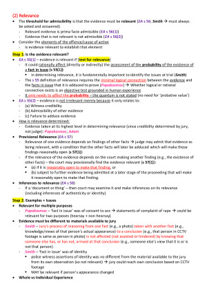 Excellent scaffold for solving exam problem questions! Also includes summaries of each topic with important points Super useful material in the mid-sem exam Topics 1) Introduction to evidence law 2) Relevance 3) Proof (i) – burdens and standards of proof 4) Adversarial trial 5) Witnesses 6) Documents, Real Evidence 7) Credibility 8) Hearsay