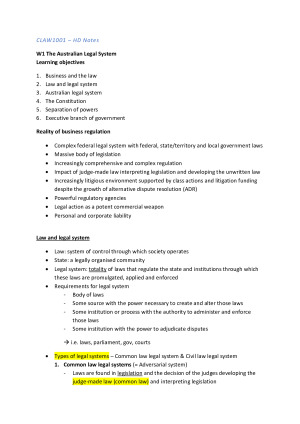 Comprehensive and well-organised note based on lectures, tutorials and textbook. Materials covered from W1 - W5. I have read the whole textbook and went all the lectures and tutorials, and combined them all into this note. A detailed case examples and screenshots included to help your understanding. I can pretty much assure you that you will never regret the purchase and can also easily get HD with this note ;) The contents of the notes are as follows: W1 The Australian Legal System W2 Parliament and legislation W3 The Courts and the Common Law W4 Contracts I W5 Contracts II If you are satisfied with this note, also consider the purchase for the note covering W6-13 uploaded. I guarantee that you will never regret the purchase.