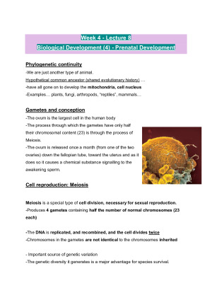 This PDF includes clear, colourful, comprehensive notes from Semester 1 Developmental Psychology 2024! Divided into clear sections for each week. Weeks 2-11 (Week 1 and Week 12 were mostly housekeeping and future directions, respectively.) Happy studying! This was a great subject :~) The table of contents/course schedule is nicely included at the top of the Word document. Week 2 - Lecture 4 Theory of Mind (ToM) Week 2 - Lecture 5 Biological Development β Introduction to Human Genetics (1) Week 3 - Lecture 6 Biological Development βHuman Genetics (2) - Genetic Disorders Week 3 - Lecture 7 Biological Development (3) β Environmental Influences Week 4 Calculating Chi-Square Week 4 - Lecture 8 Biological Development (4) - Prenatal Week 5 - Lecture 9 Biological Development (5) β Brain Development Week 5 - Lecture 10 Cognitive Development (1) - Cognitive Theories Week 6 - Lecture 11 Cognitive Development (2) - Infant Competencies 1 Week 6 - Lecture 12 Cognitive Development (3) - Core Knowledge Theories Week 7- Lecture 13 Cognitive Development (4) - Sociocultural Theories Week 7 - Lecture 14 Cognitive Development (5) β Language Development Week 8 - Lecture 15 Cognitive Development (6) β Language 2 - Phonology & Word Segmentation Week 9 - Lecture 17 Cognitive Development (7) β Language 3 Week 9 - Lecture 18 Social & Emotional β S&E (1) - Self Development Week 10 - Lecture 19 S&E (2) - Social Development (peers) Week 10 - Lecture 20 S&E (3) Social Development β (family) Week 11 - Lecture 21 S&E (4) β Emotional development (Emotion regulation) Week 11 - Lecture 22 S&E (5) β Emotional Development (Mental Health/ Wellbeing)