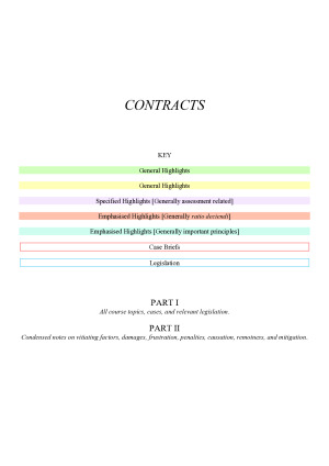 These notes cover the entirety of the Contracts (LAWS1075) course in long-form (Part I of the Notes) and provide the post-mid term content in hyper-condensed form for quick reference in timed final exams (Part II of the Notes). Notes of importance for exams are included across the document. The long-form Part of the notes includes a case brief for all major cases which in turn include explanatory highlights. Extracts of all relevant legislation are included and where relevant, colour coded. Signposted exams tips are included. This Part is most useful for revision for class participation and long-release assessment. The short-form Part of the notes hyper-condenses the post-mid term content for the Final Examination. It includes all relevant principles, case ratios and is cited by short-hand. The topics covered are Express Terms & Incorporation; Construction; Exclusion Clauses; Implied Terms; Termination; All ACL Content, Contracts Review Act (Unjust Contract Terms); Damages; Doctrine of Frustration; All Vitiating Factors (including Statutory Vitiating Factors). A redacted sample of both Parts is provided