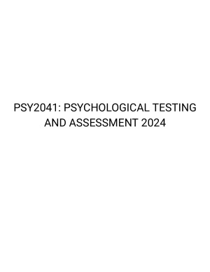 I take the time to create notes from the lecture material in a way that makes it easy for me to understand, so that revising them later is much simpler. Week 1 - Intro to psychological testing Week 2 - Reliability and validity Week 3 - Test development Week 4 - Quantitative methods I Week 5 - Quantitative methods II Week 6 - Intelligence testing Week 7 - Educational testing Week 8 - Quantitative methods III Week 9 - Quantitative methods IV Week 10 - Organisational testing Week 11 - Clinical testing Week 12 - Neuropsychological testing