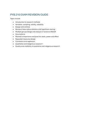 These notes are what I used for my final exam to receive a 7 and the QUT Executive Deans' Commendation for Academic Excellence Semester 1, 2024. Notes are compiled from lectures, tutorials and extensive research. They cover ALL relevant theories and experiments as well as summary notes on all topics and sub-topics. Topics include: • Introduction to research methods • Variables, sampling, validity, reliability • Design and controls • Review of descriptive statistics and hypothesis testing • Multiple groups design and analysis of variance ANOVA • Assumptions • Planned comparisons and post hoc tests, power and effect • Repeated measures design • Correlation and regression • Qualitative and indigenous research 1 • Quality and credibility in qualitative and indigenous research Boost your exam prep with these concise, easy-to-follow notes perfect for last-minute revision or dedicated students looking to excel!
