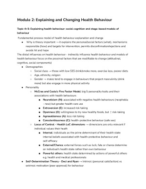 I received a score of 6/7 for 2010PSY however, an important note to mention is that I only study for ~1 day for the final exam and these notes were the key to that success. Details: · Organized and detailed notes · Compilation of all lecture notes/book notes · Contain comprehensive diagrams · Attached at bottom of file are links to complete flashcards Examable Modules Covered: Module 1: Health Psychology and Health Behaviour Module 2: Explaining and Changing Health Behaviour Module 3: Stress, Coping, and Illness Topics covered: Topic 1: Health Definitions and Health Differentials Topic 2: Health-risk Behaviours Topic 3: Health-protective Behaviours Topic 4 and 5: Explaining Health Behaviour Topic 6 and 7: Changing Health Behaviour Topic 8: Symptom Perception and Seeking Help Topic 9: Theory and Moderators Topic 10: Impact of Illness on and Improving Quality of Life