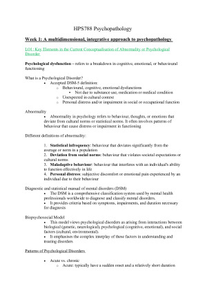 Week 1: A multidimensional, integrative approach to psychopathology Week 2: Models of Psychopathology Week 3: Anxiety Disorders, Stress and Trauma-Related Disorders, OCD Week 4: Mood Disorders and Suicide Week 5: Substance-Related and Addictive Disorders Week 6: Neurodevelopmental Disorders Week 7: Schizophrenia Spectrum and Other Psychotic Disorders Week 8: Personality Disorders Week 9: Eating Disorders Week 10: Cultural Approaches to Psychopathology