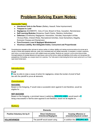 Comprehensive and detailed problem question scaffold notes to help with the final exam. TOPICS: Intentional Torts to the Person (Battery, Assault, False Imprisonment) Trespass to Land Negligence (ELEMENTS - Duty of Care, Breach of Duty, Causation, Remoteness) Self Learning Modules (Nuisance, Death Claims) Defences (Contributory Negligence, Intoxication, Voluntary Assumption of Risk, Obvious Risks, Inherent Risks, Recreational Activities, Good Samaritans, Illegality, Exclusion Clauses and Disclaimers) Pure Economic Loss & Negligent Misstatement Vicarious Liability, Non-Delegable Duties, Concurrent and Proportionate