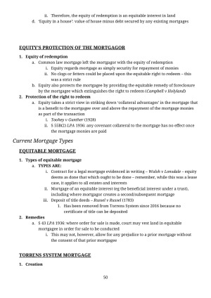 Property law (LAW 1506) notes - all topics covered. Suitable for primary exams. Topics consist of: 1. Title by registration, Torrens System and Indefeasibility 2. Doctrines of Tenure & Estates, Possession, Relativity of Title, Waste 3. Licenses, Leases and the Residential Tenancies Act 1995 4. Easements, Profits à Prendre, Restrictive Covenants 5. Co-ownership, Strata Title 6. Mortgages 7. Origin & Nature of Equitable Interests 8. Registered Priorities, Exceptions to Indefeasibility 9. Unregistered Interests