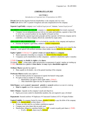 Complete detailed BLAW20001 Corporate Law (2024) notes comprising examinable material. I received a mark of 90+ for this subject, using these notes for my revision and end-of-semester examination. Topics include: Incorporation process and its consequences Regulation on company shareholders and directors and their effects on those who deal with companies Internal composition of companies How companies can enter into contracts with outsiders and what the outsiders can assume when dealing with company participants Duties and liabilities of company directors and other officers The actions and remedies you can take against a company if you have been wronged or harmed by the company or its participants.