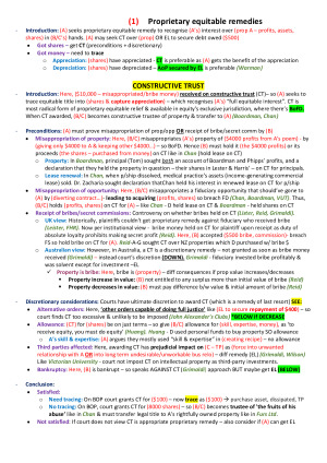 - Comprehensive, 22-page, colour-coded exam template notes! - Organised into easy-to-navigate sections with subheadings, these notes provide brief case analogies for quick reference and real exam examples (in brackets) to help you correlate facts effortlessly. - Received a HD for these notes - very helpful and useful!! Topics: (1) Breach of Confidence (2) Breach of Fiduciary Duty (Conflicts Rule & Profits Rule) (3) Personal Equitable Remedies (4) Proprietary equitable remedies (5) Tracing (6) Assignment of Proprietary Rights