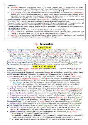 LAW2102 Contract B Law Notes. - Comprehensive, 23-page, colour-coded exam template notes! - Organised into easy-to-navigate tables with subheadings, these notes provide brief case analogies for quick reference and real exam examples (in brackets) to help you correlate facts effortlessly. - Received a 90 for the unit - in the Exam and Assignment overall Topics: (1) Termination (2) Election & Restrictions (3) Damages (4) Liquidated Damages & Penalties (5) Specific performance & Injunction (6) Action for Debt (7) Restitution (8) Frustration (9) Common law vitiating Factors (10) Statutory vitiating factors