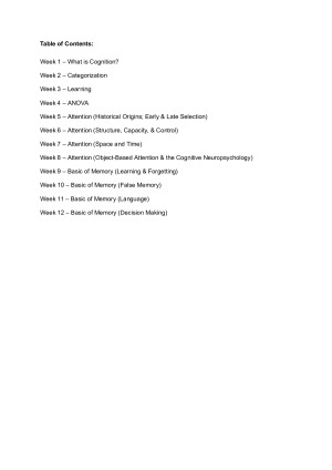 Summary Notes for PSYC2007 (Newest Version - 2024 syllabus)!!! - Cover all topics: W1: What is Cognition? W2: Categorization W3: Learning W4: ANOVA W5: Attention (Historical Origins; Early & Late Selection) W6: Attention (Structure, Capacity, & Control) W7: Attention (Space and Time) W8: Attention (Object-Based Attention & Cognitive Neuropsychology) W9: Basic of Memory (Learning & Forgetting) W10: Basic of Memory (False Memory) W11: Basic of Memory (Language) W12: Basic of Memory (Decision Making) - Easy to understand and memorize! --> MOST IMPORTANT: modified after taking the final exams in 2024🤫 (so only important content included!) - Very useful for the Final Exam~~~ I only reviewed this note and did the practice exam that the school provided, and I got a high H1 (93%) for my final exam. This note includes all the information to get a High H1 for PSYC20007!!!