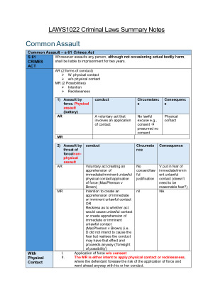 Topics include: - Common Assault - Defences to common assault: Consent; Lawful correction; - Aggravated Assault - Sexual Assault - Stalking and Intimidation; Choking, Suffocation, Strangulation - Murder: Intent to cause death, GBH, Reckless Indifference - Murder 2: Constructive Murder - Murder 2: Manslaughter - Manslaughter by Unlawful Act - Other Offences Causing Death - Fraud - Larceny - Complicity – JCE, EJCE - Accessorial Liability - Conspiracy Defences Overview - Mental Health and Cognitive Impairment - Fitness to Stand Trial - Automatism - Substantial Impairment - Intoxication - Self-Defence - Provocation These notes helped me smash the problem question during finals. All the topics and how to go about them are fully summarised for your ease.