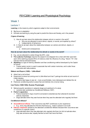 PSYC2081 Learning and Physiological Psychology (87) DETAILED NOTES