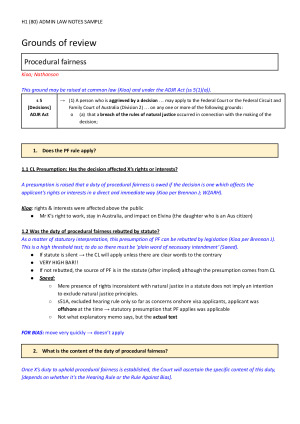H1 notes for the entire Admin Law subject, including hypothetical/exam answer structures and OLAM notes (for MLS students). CONTENTS: 1. Judicial review hypothetical answer structure 2. Merits review 3. Judicial review - Jurisdiction -Remedies - Standing - Grounds of review * Procedural fairness: fair hearing, bias rule * Want of jurisdiction * Error as to jurisdictional fact * Acting without legal authority * Relevant/irrelevant considerations * Inflexible application of policy * Unreasonableness * Improper purpose * Invalid delegation of discretionary power * Delegated legislation - Privative clauses - Consequences of breach