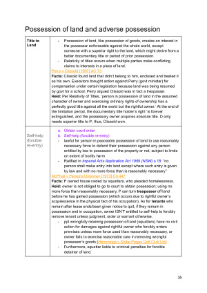- Received 85/100 (High Distinction) - Comprehensive, Colour-Coded Exam Notes covering all topics and materials from weeks 1-10 - Cases are analysed in detail. Trickier fact scenarios and concepts include diagrams to simplify explanations. - Spent over 100 hours making and refining these notes. - Extremely useful for exam preparation, the mid-term assignment, and class participation. - Includes exam response scaffolds for equitable estoppel, agency, part performance, adverse possession, fixtures, and torts for the possession of goods. Happy studying! Topics Covered: Elements of A Contract Privity Property Licence Types Fixtures Ownership and Bailment Remedies: Trespass, Conversion, Detinue Adverse possession Acquisition of Property Rights and Equitable Property Part Performance Equitable Estoppel Agency