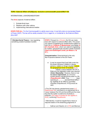 Provides detailed exam answer structures for the following topics: - Manner and Form - Executive Power of the Commonwealth (Cth) - Cth Legislative Power: Characterisation - External Affairs - Corporations Power -Spending Powers -Intergovernmental Immunities - Separation of Powers - Implied Political Freedoms -Section 92 - Section 109