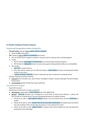 These notes have concise summaries of lecture notes, legislation and cases that allowed me to obtain 48/50 in the written assignment and HD in the final exam. Topics include: - Introduction and the difficulties in regulating science - Mitochondrial donation - Using human embryos in research (cloning, stem cells, hybrids and genetically modifying humans) - Genetically modified organisms - Genetically modified food - Assisted reproduction - Genetic diagnosis - Genetic information - Genetic resources