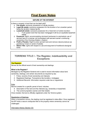 Detailed final exam notes including case law and statute where relevant on the examinable topics only. Topics: - TORRENS TITLE I - The Register, Indefeasibility and Exceptions - TORRENS TITLE II - Torrens Assurance Fund; Caveats and Priority Notices - TORRENS TITLE III - Formalities and Priorities - LEASES II - Assignment; Termination - Covenants