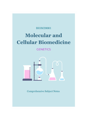 Comprehensive MCB notes for GENETICS! - Includes contents and page numbers for easy navigation Topics included: Genome, chromosome & gene - What is a genome? - What is a gene - Pseudogenes - Repetitive elements - Chromatin structure - Origins of replication - Telomeres - Centromeres - Transcription: RNA pol - Transcription: initiation - Transcription: elongation and termination - Splicing - Genetic code - Translocation Gene regulation - General principles - Ligand-regulated DNA binding - Prokaryotic gene regulation - Lac operon - Eukaryotic gene regulation - Globin gene regulation - Globin gene mutations & disease - Epigenetics Cancer - Introduction to cancer - Oncogenes and tumour suppressors - DNA damage and repair - Oncogene examples - P53 - Metastasis - Cancer progression - Epigenetics Development - Introduction to development - Key concepts of development - Drosophila segment hierarchy - Hox genes - Model organisms - DNA sequencing - Human genome projects - Personal genomics - Frontiers of genetics in human health