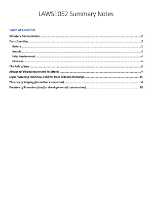 I received a final exam mark of 88 using these notes. They include comprehensive problem question templates, each of which are colour coded and lay out all the legislation, cases, and equitable maxims you'll need. The notes also include a summary of each course theme for the essay component of the exam, including definitions, examples, detailed case summaries, and relevant theory. The notes are organised under the following sub-headings: - Statutory Interpretation Template - Torts Question Template (Battery, Assault, False Imprisonment, Defences) - The Rule of Law - Aboriginal Dispossession and its Effects - Legal Reasoning - Theories of Judging (Formalism v Activism) - Doctrine of Precedent / Development of Common Law