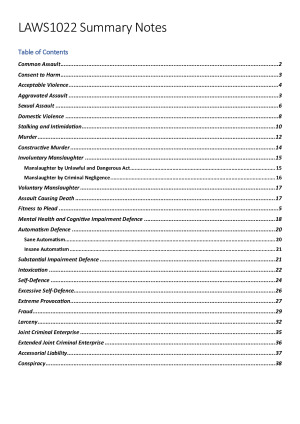 I received a final exam mark of 83 using these notes. These full course, final exam notes include comprehensive problem question templates, each of which are colour coded and lay out all the legislation, and cases you'll need. The notes also include a summary of each course theme for the essay component of the exam, including definitions, detailed case summaries, statistics and relevant theory. The notes are clear and succinct, set out in tables in diagram so it is easy to find what you need in exam conditions. The notes are organised under the following sub-headings: - Common Assault - Consent to Harm - Acceptable Violence - Aggravated Assault - Sexual Assualt - Domestic Violence - Stalking and Intimidation - Murder - Constructive Murder - Involuntary Manslaughter (Manslaughter by Unlawful and Dangerous Act AND Manslaughter by Criminal Negligence) - Voluntary Manslaughter - Assault Causing Death - Fitness to Plead - Mental Health and Cognitive Impairment Defence - Automatism Defence (Sane and Insane) - Substantial Impairment Defence - Intoxication - Self-Defence - Excessive Self-Defence - Extreme Provocation - Fraud - Larceny - Joint Criminal Enterprise - Accessorial Liability - Conspiracy